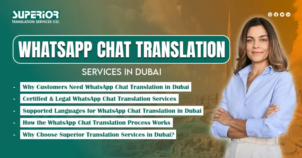 Get your WhatsApp chat translation services in Dubai from Superior Translation Services —a certified, and trusted translation firm that provides fast, secure and online translations for personal, business, legal and court-use matters. Located near Bur Dubai / Karama, we translate WhatsApp chats for UAE courts and lawyers, police, HR departments and embassies. With delivery and pickup throughout Dubai and 24/7 support and a strict level of confidentiality, we guarantee that your conversations on WhatsApp are legally acknowledged. For immediate assistance, WhatsApp(+971502827098) or email(info@superiordubai.com).